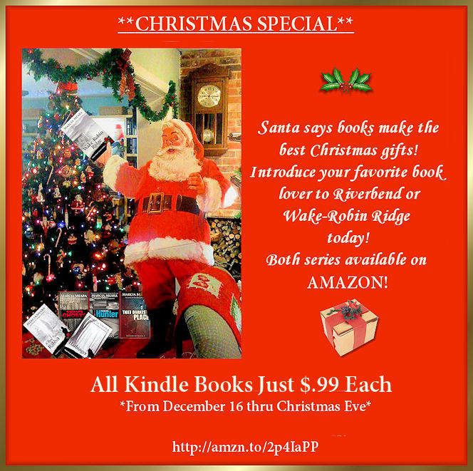 Yep, you read right. Every one of my ebooks will be a mere $.99 from tomorrow (December 16) through Christmas Eve, so if you’ve been considering reading either series, now’s your chance to get these books at a bargain price! Six full-length novels and two novellas! Hope you’ll check them out and will share the news around social media. THANKS!