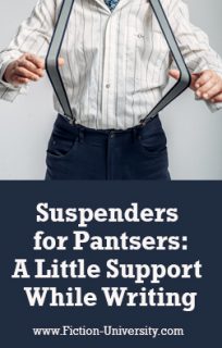 These days, if you ask me whether I’m a plotter or a pantser, I’ll respond that I’m a pantser with suspenders. Sounds like a painful wedgie in the making, doesn’t it? It’s not, trust me. And what’s more, the various “suspenders” I’ve come to rely on, have kept me from losing my pants and falling on my face on multiple occasions.