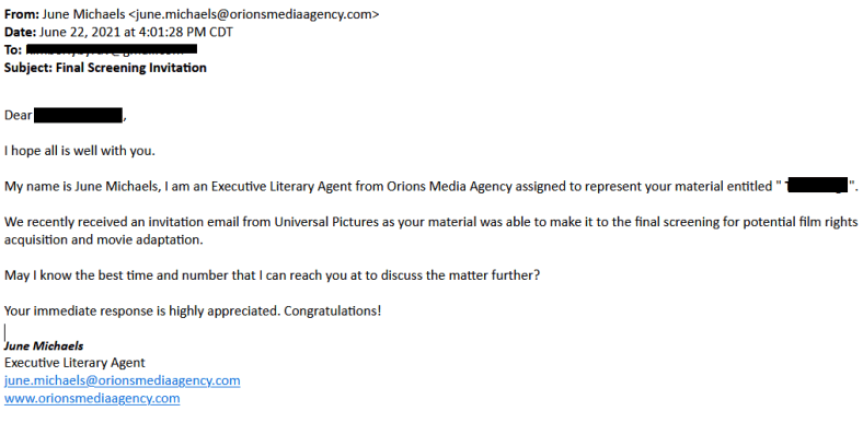 I’ve written a number of posts about scammers impersonating literary agents and publishers. Writers should be aware that they’re also impersonating major motion picture studios.