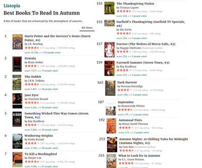 However, the second top voted book is Dracula by Bram Stoker. Classics dominate the first page of this list, but I remember a definite feeling of Autumnal weather as part of the setting for this amazing story. It also makes a good lead-in to those October Halloween books.